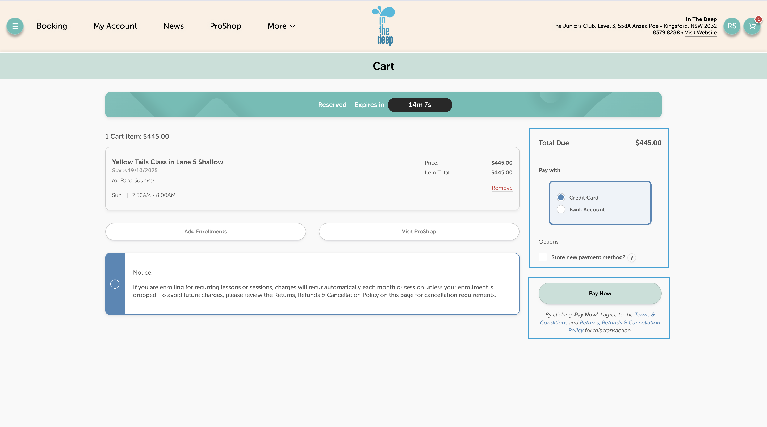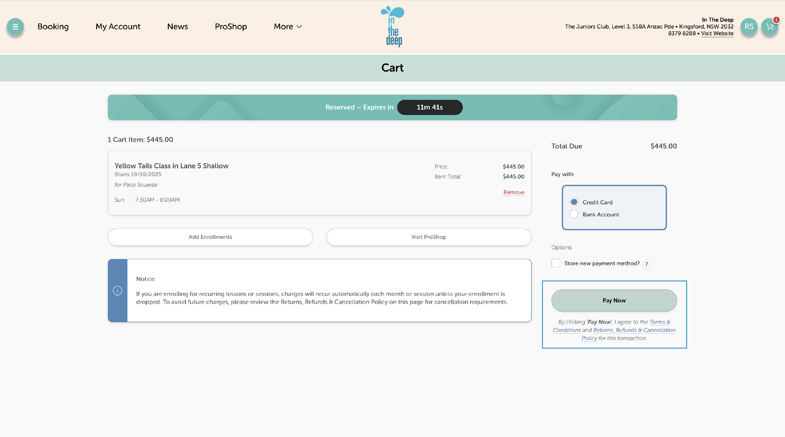 - Choose between bank account (direct debit with no fees!) or credit card (Visa, Mastercard, Amex).