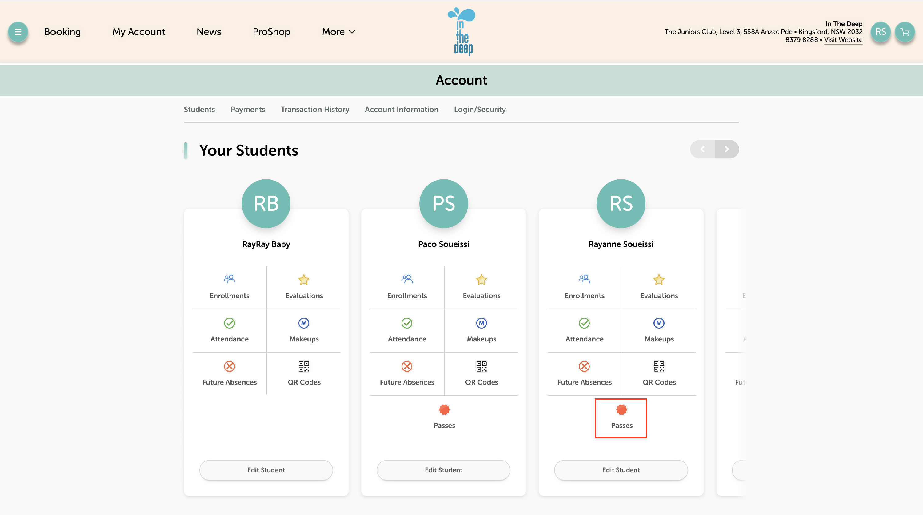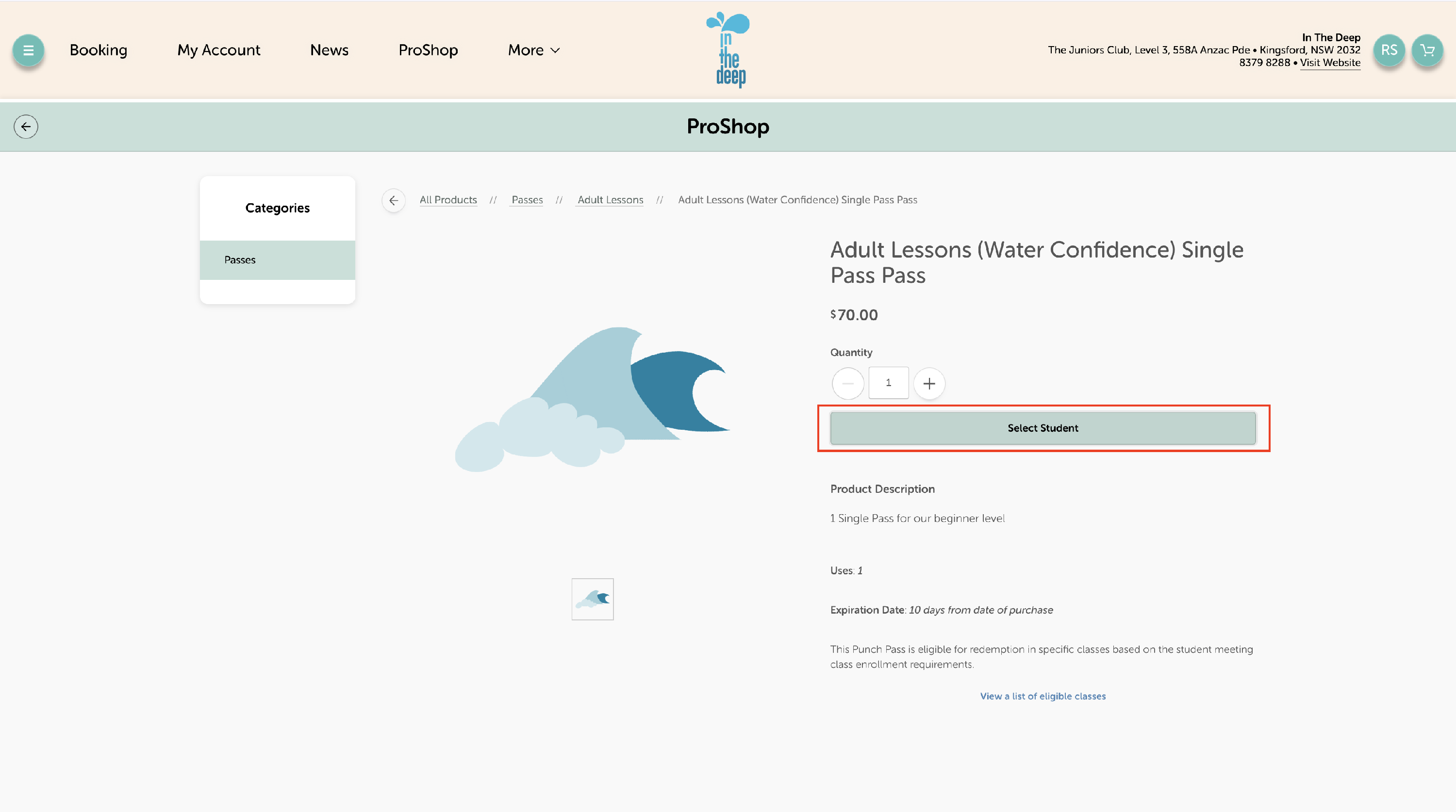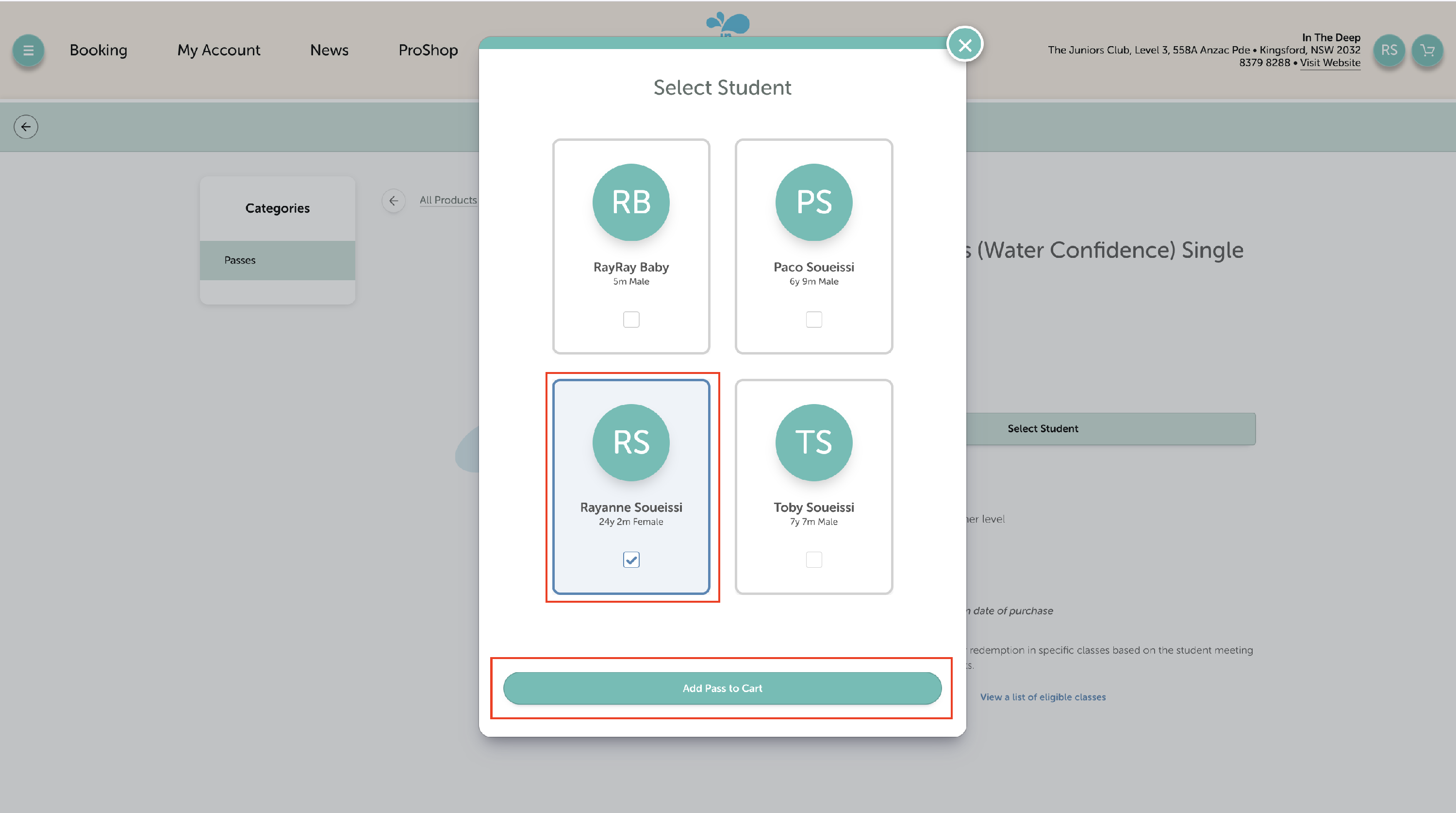 - Click 'Select Student' to book the pass for the right swimmer
