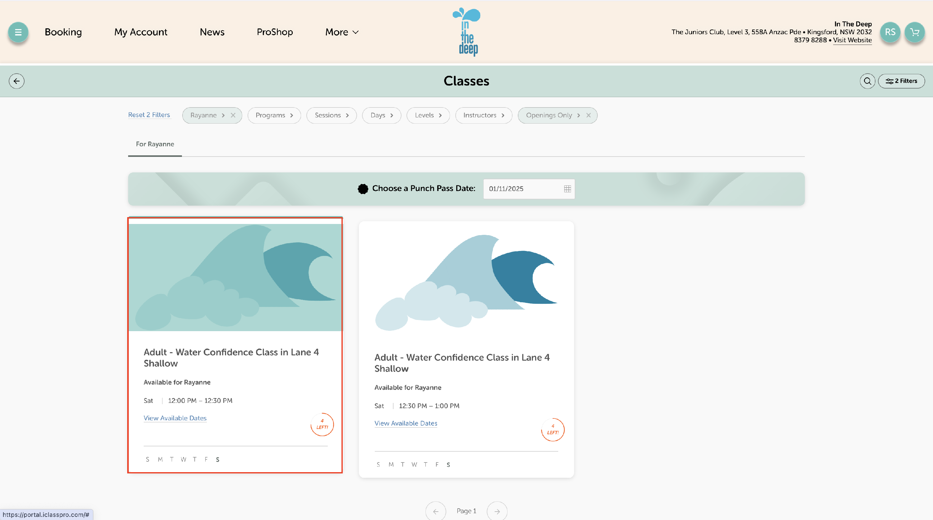 - Filter by day: Select Saturday as this is when classes are currently run